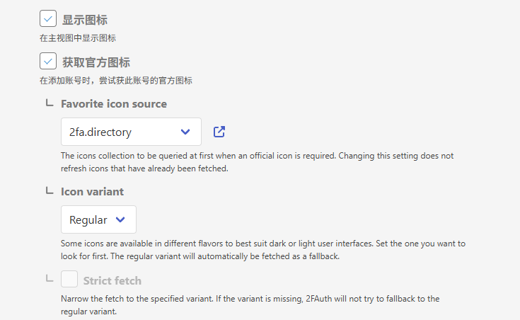 如果你依然想要自动图标,尝试修改 Favorite icon source。- 默认可能是连接不畅的源,将其改为 2fa.directory(如图所示)或者其他你服务器能访问通的源。